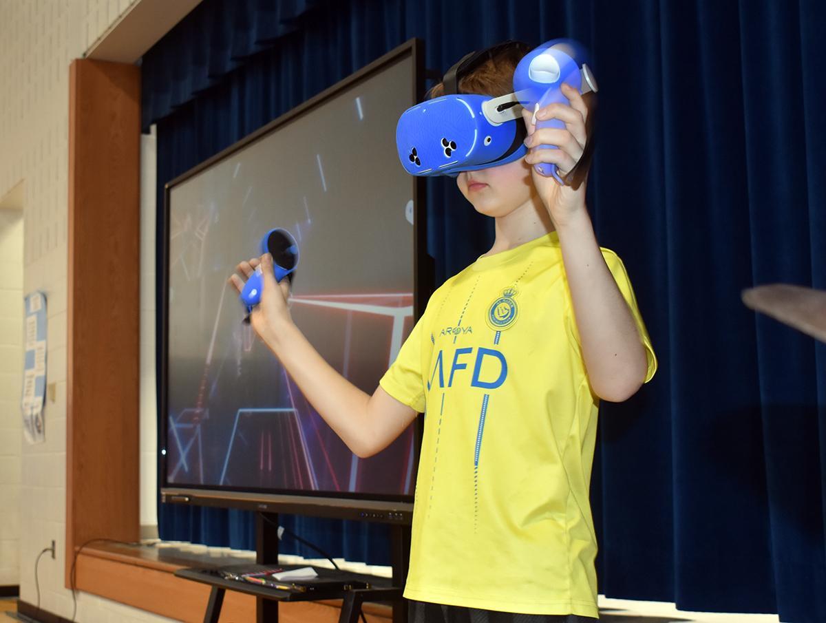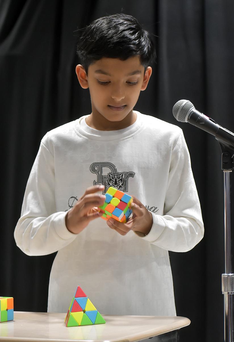 Sixth-grader Kayden Cosgrove offered an acrobatics routine; sixth-grader Maxwell Pulling demonstrated the VR rhythm game Beat Saber; and fifth-grader Vidhyuth Jayamanikandan completed three Rubik’s cubes in under three minutes.