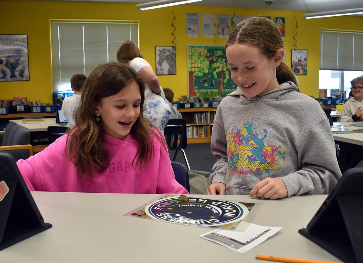 Fifth- and sixth-graders are attempting to break the longest time spinning a coin record (25.71 seconds), which was last broken on July 17, 2014. Students are working in pairs, taking turns spinning a coin while timing each attempt.